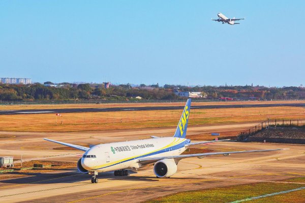 11月18日8:30,中國郵政航空波音777F全貨機滿載郵貨自盧森堡落地南京祿口國際機場后,向郵政自管機坪滑行。