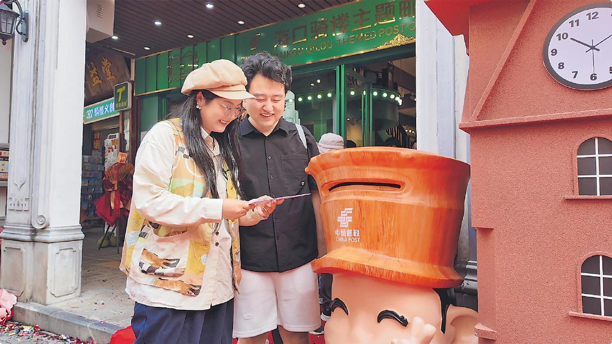 ??隍T樓老街是首批“中國歷史文化名街”。騎樓主題郵局位于老街中心位置,郵局一樓設(shè)有打卡蓋戳區(qū)、文創(chuàng)產(chǎn)品區(qū)、集郵品區(qū)、政務(wù)圖書區(qū)、海南特產(chǎn)區(qū)和郵??Х劝桑辜苌蠑[滿了騎樓燈籠冰箱貼和騎樓主題郵局紀念封、主題郵冊等集郵文創(chuàng)產(chǎn)品;二樓陳列著郵政老照片、珍貴郵票,復(fù)原的老郵政辦公區(qū)成為熱門打卡點位。圖為一對來自甘肅的新婚夫婦在騎樓主題郵局郵寄紀念封,留下一份蜜月度假的美好記憶。