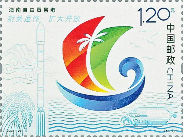 12月18日,海南自由貿(mào)易港將正式啟動(dòng)全島封關(guān)運(yùn)作。這一重大舉措,標(biāo)志著中國(guó)對(duì)外開放進(jìn)入全新階段,對(duì)于加快吸引全球優(yōu)質(zhì)要素集聚、促進(jìn)海南自貿(mào)港高質(zhì)量發(fā)展具有重要意義。郵票畫面以海南自由貿(mào)易港形象標(biāo)識(shí)為主體,左上角表現(xiàn)了“封關(guān)運(yùn)作 擴(kuò)大開放”宣傳語;畫面背景繪有五指山、稻穗、火箭、深海勇士號(hào)載人潛水器、數(shù)據(jù)傳輸(無色熒光)等元素,展現(xiàn)出“五向圖強(qiáng)”高質(zhì)量發(fā)展新圖景,寓意海南自貿(mào)港向著加快建設(shè)具有世界影響力的中國(guó)特色自由貿(mào)易港目標(biāo)奮勇前進(jìn)。