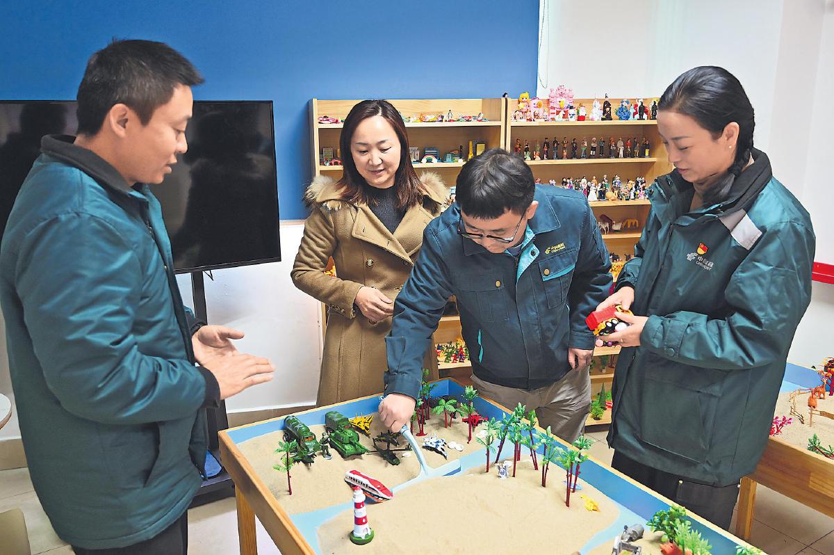 在昆明郵區(qū)中心,心理導師向員工介紹“心理沙盤”的使用方法。 □趙焱 攝
