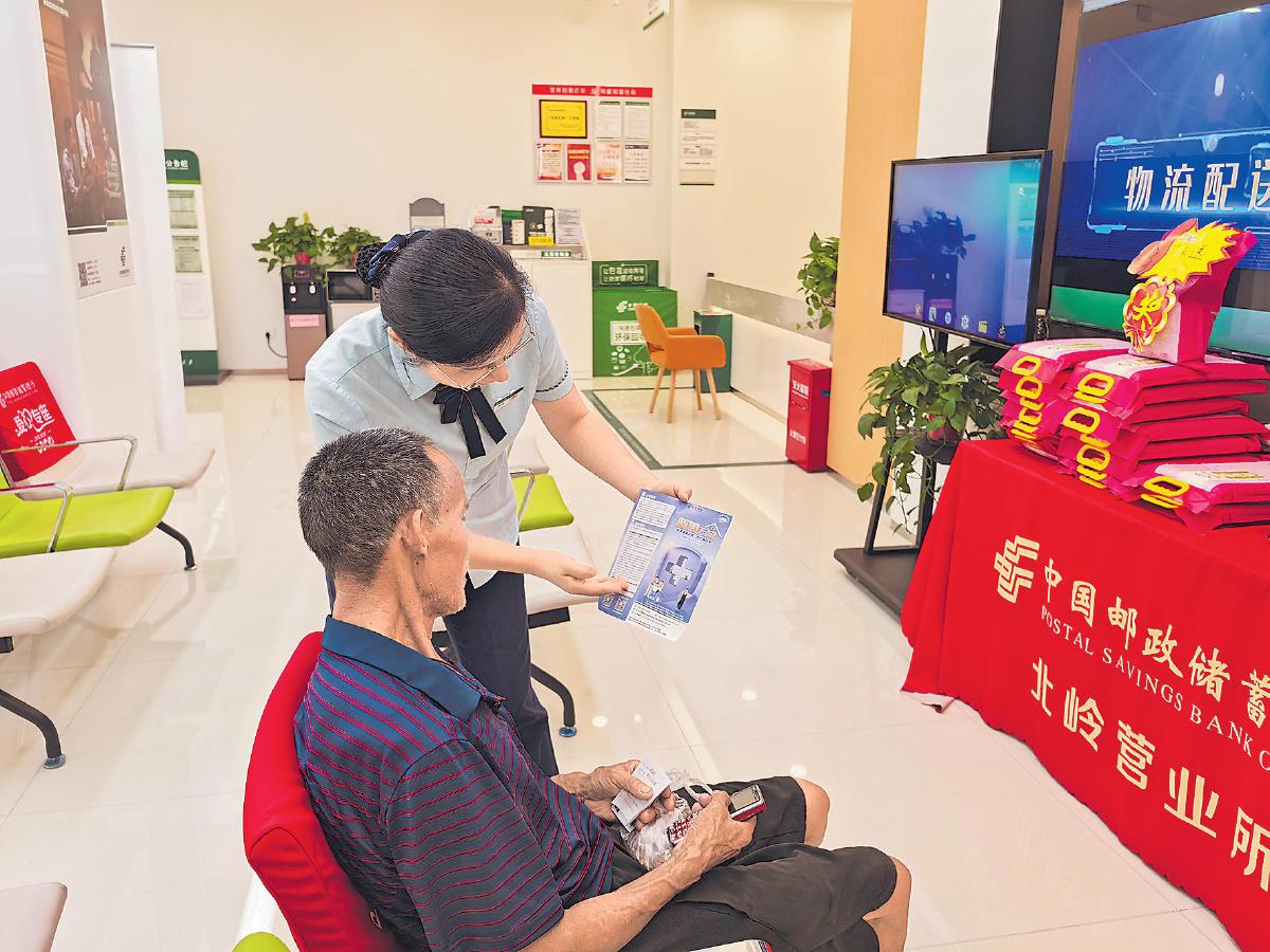 針對(duì)老年群體需求,郵政工作人員宣傳定制化普惠保險(xiǎn)業(yè)務(wù)。