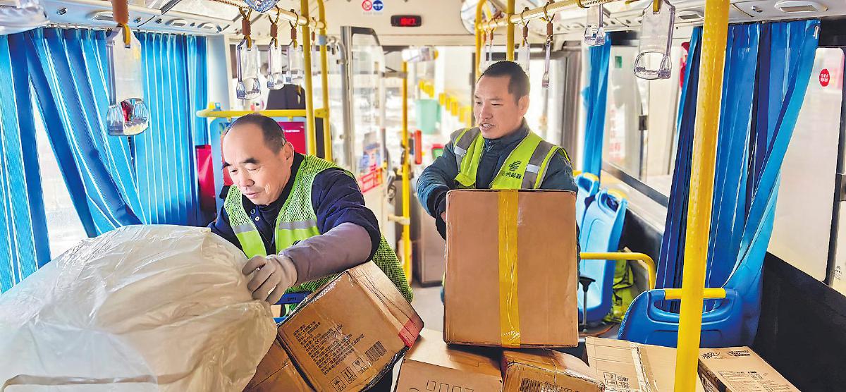 古井鎮(zhèn)郵政鎮(zhèn)級(jí)運(yùn)營(yíng)中心投遞員葉魏從公交車駕駛員手中接過待投包裹。
