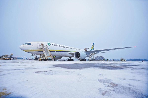 1月19日上午,河南鄭州新鄭國際機場的飄雪裹著寒意,一架鄭州至盧森堡的郵航全貨機??吭跈C坪。郵航地勤人員穿梭其間,將一板板郵貨穩(wěn)穩(wěn)裝入機艙——這架身披郵政標識的飛機即將帶著風雪里的牽掛與年貨,沿著國際郵路奔赴遠方,成為新春里跨越山海的溫暖聯(lián)結(jié)?! 趵钇健z