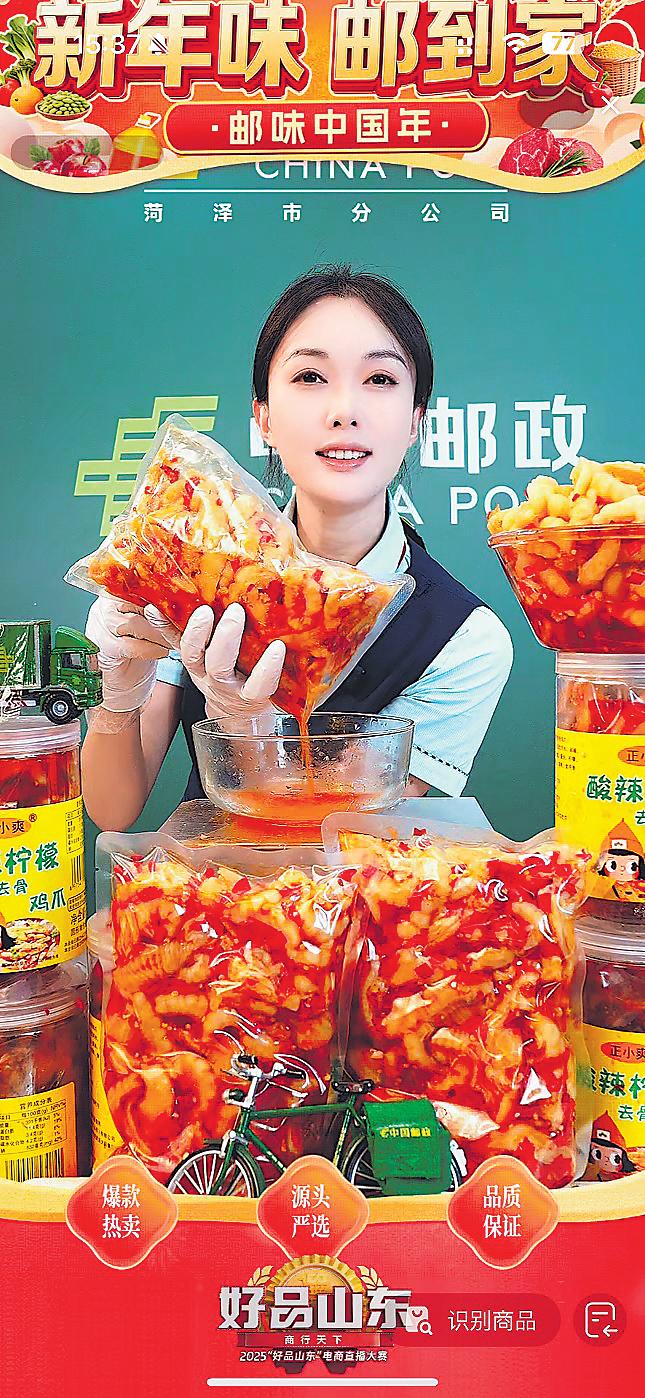 “‘年貨節(jié)’福利來了!無骨雞爪酸辣開胃,佤味雞爪麻辣鮮香,為春節(jié)家宴增添美味!”在菏澤郵政“年貨節(jié)”主題直播間,主播的熱情推薦迅速激發(fā)消費(fèi)意愿,讓這場精心籌備的年貨直播一炮而紅。