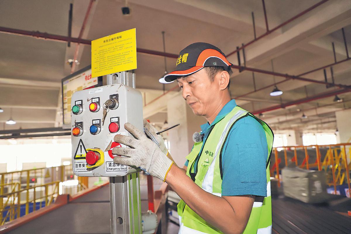 在??卩]區(qū)中心的設(shè)備控制機(jī)房,設(shè)備技術(shù)骨干謝式鵬緊盯著場(chǎng)地視頻監(jiān)控和設(shè)備終端監(jiān)控屏幕。實(shí)時(shí)監(jiān)測(cè)到自動(dòng)分揀設(shè)備(OBR)的運(yùn)行數(shù)據(jù)有異常后,他立即通知前端調(diào)整作業(yè)模式,切換為人工掃描供包。在發(fā)現(xiàn)14號(hào)供包臺(tái)出現(xiàn)故障后,他又?jǐn)y帶工具包抵達(dá)現(xiàn)場(chǎng)進(jìn)行修理,并憑借熟練的技能和豐富的經(jīng)驗(yàn),快速完成排障修復(fù)。隨后,他又來到小件機(jī)主控制柜前,向現(xiàn)場(chǎng)作業(yè)主管講解技改后的設(shè)備原理和操作要點(diǎn),并現(xiàn)場(chǎng)答疑解惑,將經(jīng)驗(yàn)轉(zhuǎn)化為團(tuán)隊(duì)共同的能力。