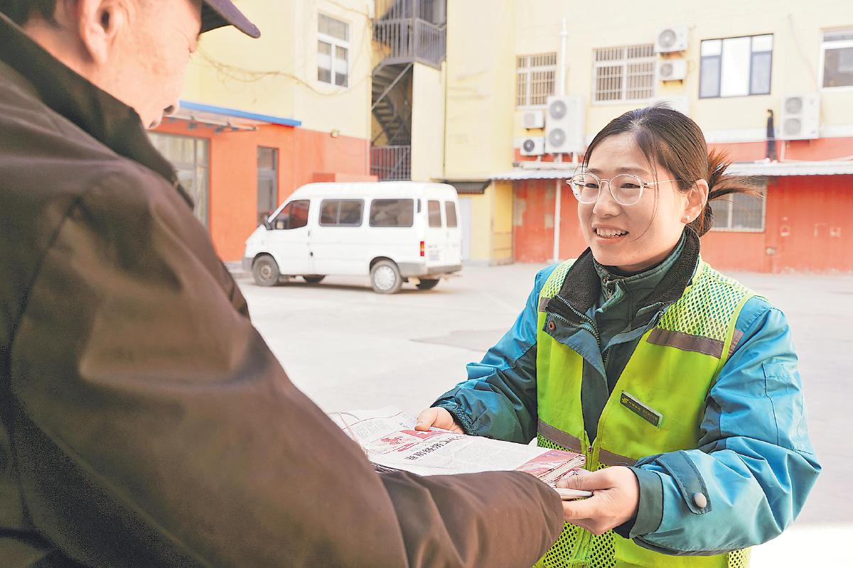馮翠翠把報(bào)紙投遞到單位值班人員手中。