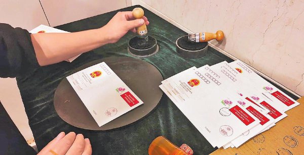 3月5日,郵政工作人員為全國(guó)兩會(huì)紀(jì)念封加蓋紀(jì)念戳。一枚枚紀(jì)念封,用郵政語(yǔ)言記錄兩會(huì)時(shí)刻。