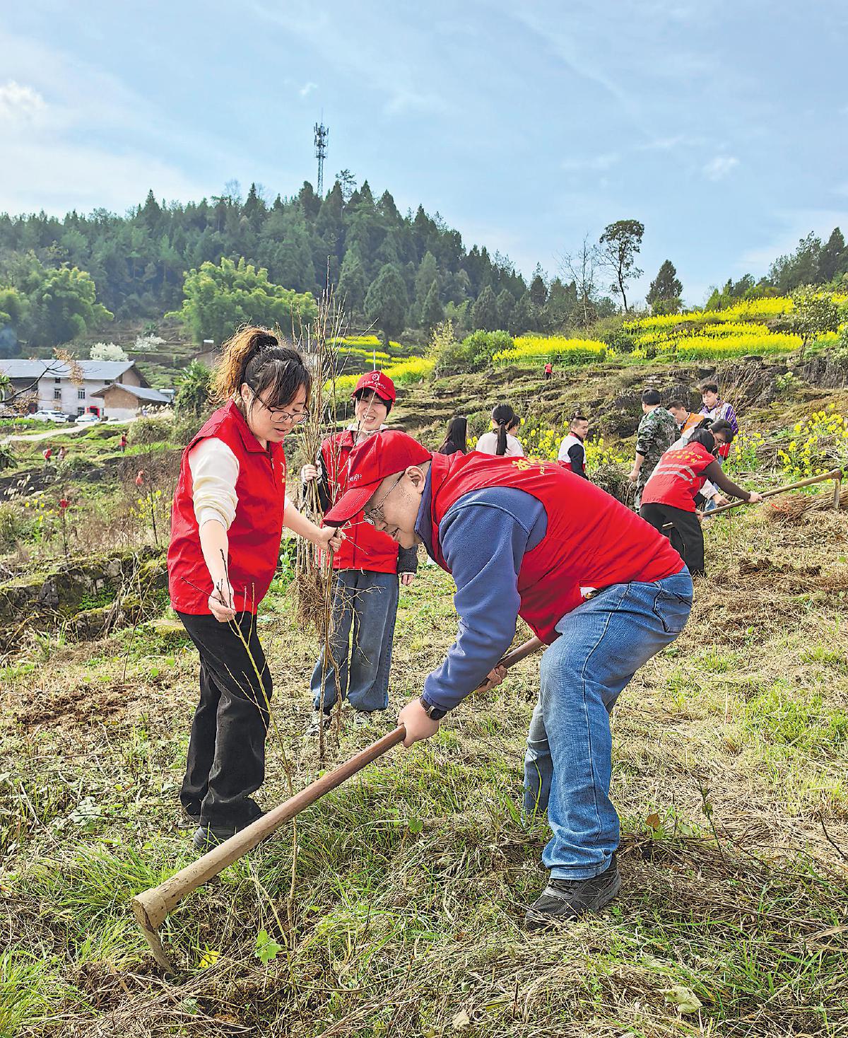 重慶市南川區(qū)郵政分公司黨總支聯(lián)合團區(qū)委、水江鎮(zhèn)黨委開展黨建共建活動,組織黨團員志愿者走進下樂村,開展春季義務植樹。大家共栽種桃樹、櫻花樹300棵,踐行了綠色發(fā)展理念,生動展現(xiàn)了“綠色郵政”的良好形象?!踮w娟 攝影報道