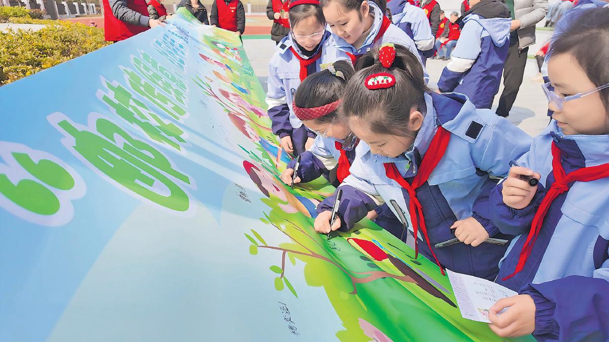 江蘇省南通市海門區(qū)郵政分公司聯(lián)合海門街道城北社區(qū)、張謇小學開展“郵校傳綠意 社區(qū)護新芽 童心植希望”主題實踐活動?;顒蝇F(xiàn)場,孩子們齊聲宣讀“愛綠護綠”倡議書,聯(lián)手繪制8米長“綠色畫卷”,以稚嫩筆觸勾勒青山綠水、鳥語花香的生態(tài)圖景,隨后投出“美麗海門”明信片,將綠色寄語寄往未來?!跬鯕g 攝影報道