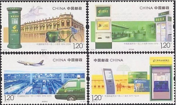 2016年3月20日,中國郵政發(fā)行《中國郵政開辦一百二十周年》紀(jì)念郵票1套4枚(圖4),展現(xiàn)了中國郵政的悠久歷史及現(xiàn)代化發(fā)展。第1枚郵票“信達(dá)天下”選用清代郵政天津局舊址、古代驛使雕塑、郵政自行車、郵筒等元素,展現(xiàn)了中國郵政120年的歷史畫卷,傳遞了中國郵政“信達(dá)天下”的歷史使命。第2枚郵票“便民服務(wù)”選用郵政服務(wù)大廳、便民服務(wù)站、易郵柜等元素,表現(xiàn)了中國郵政努力踐行“便民服務(wù)”的理念。第3枚郵票“速遞物流”選用現(xiàn)代化速遞物流集散中心、郵運(yùn)汽車、飛機(jī)等元素,凸顯中國郵政速遞物流方便快捷、安全可靠的優(yōu)勢。第4枚郵票“普惠金融”選用郵政儲蓄銀行營業(yè)廳、ATM機(jī)、郵政銀行卡(借記卡和信用卡)、中郵保險形象等元素,傳達(dá)“進(jìn)步與您同步”的服務(wù)理念,凸顯“普惠金融”的行業(yè)使命。為配合相關(guān)紀(jì)念活動,中國郵政還利用當(dāng)年發(fā)行的《年年有余》和《喜臨門》賀年專用郵票,印制《中國郵政開辦一百二十周年紀(jì)念》小全張1枚(圖5)。