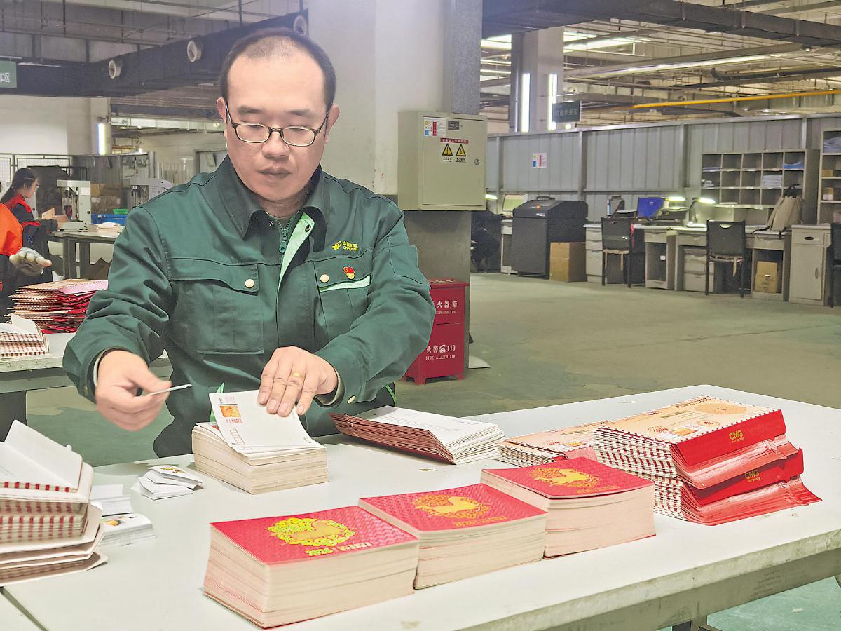 裝滿一箱箱紀念封的推車從名址打印機旁經過,幾分鐘內,第一批近千件紀念封已打印完成。這里是“春晚寄福”紀念封出發(fā)的“第一站”,也是質量把控的第一道關口。打印位置準確、條碼清晰、地址信息完整,是檢驗合格的三項硬指標。張桐與業(yè)務骨干李海征緊盯著打印機出口,不時用掃描器核驗條碼?!按和淼泥]品承載著客戶的期待,名址打印容不得半點差錯。一旦出現偏差,郵件就可能無法送達。我們必須嚴格控制精度,不辜負每一份信任?!睆埻┱f。