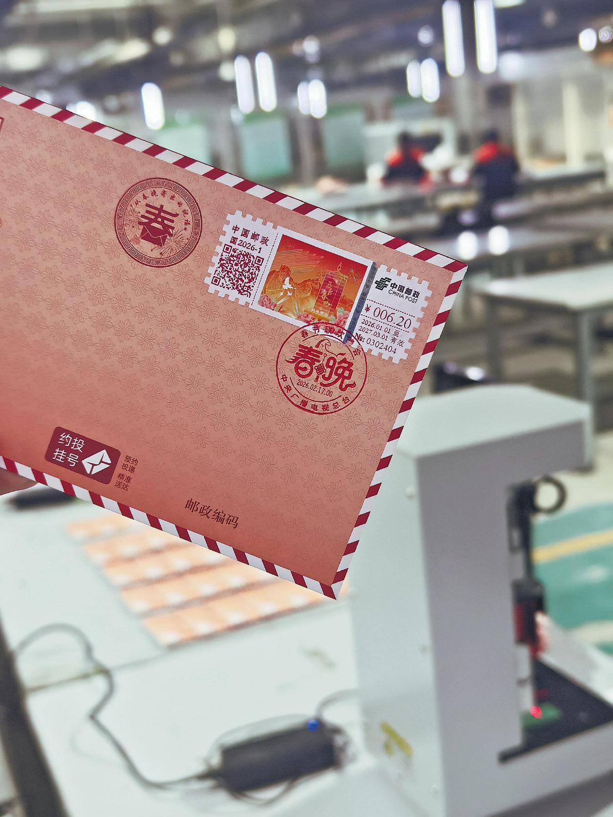 自1月初至除夕當天,所有通過線上下單的“2026年春晚寄?!奔o念封套裝,正陸續(xù)在這里完成打印、封裝、蓋戳和郵寄。