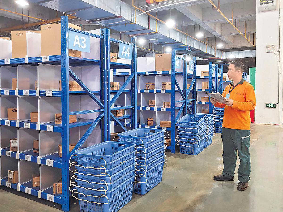 郵政工作人員查看集運(yùn)倉庫包裹情況。