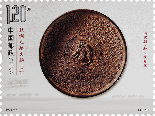 神人紋銀盤出土于甘肅省靖遠(yuǎn)縣北灘,藏于甘肅省博物館,是中國(guó)絲綢之路上發(fā)現(xiàn)的重要羅馬文物,據(jù)考證于公元四到五世紀(jì)傳入中國(guó)。盤內(nèi)壁滿飾浮雕花紋,分三圈列置。外圈飾勾連的葡萄卷草紋,其間棲有小鳥、蜜蜂等小動(dòng)物。中間一圈浮雕為古希臘奧林匹斯十二神的頭像,每個(gè)頭像左側(cè)各有一只動(dòng)物。中心為一高浮雕男性倚一花豹而坐。郵票采用啞沙和三維浮雕起凸工藝的融合應(yīng)用,呈現(xiàn)銀盤的細(xì)節(jié)特征和質(zhì)地紋理。此件器物發(fā)現(xiàn)于絲綢之路甘肅段的黃河渡口,是研究東西方經(jīng)濟(jì)文化交流交往的重要實(shí)物資料,也是十分罕見(jiàn)的絲綢之路遺珍。