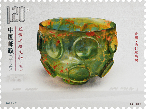 凸釘玻璃碗出土于寧夏固原市南郊的北周李賢夫婦合葬墓,現(xiàn)藏于寧夏回族自治區(qū)固原博物館。該碗為直口,矮圈足,通體透明,呈碧綠色,外壁飾以14個(gè)凸起的圓形裝飾兩周,上下錯(cuò)位排列。其內(nèi)壁光潔,外壁有薄層的金黃色分化物,其材質(zhì)屬鈣鈉玻璃,含有較多其它礦物質(zhì),該形制在薩珊時(shí)期的伊朗高原十分流行。郵票將特種光油和三維浮雕起凸組合應(yīng)用,玻璃碗晶瑩剔透的質(zhì)感和立體感躍然紙上。固原作為絲綢之路西北咽喉門戶,見(jiàn)證了東西方文化交流交融,提供了考察當(dāng)時(shí)東西方貿(mào)易極為重要的資料。
