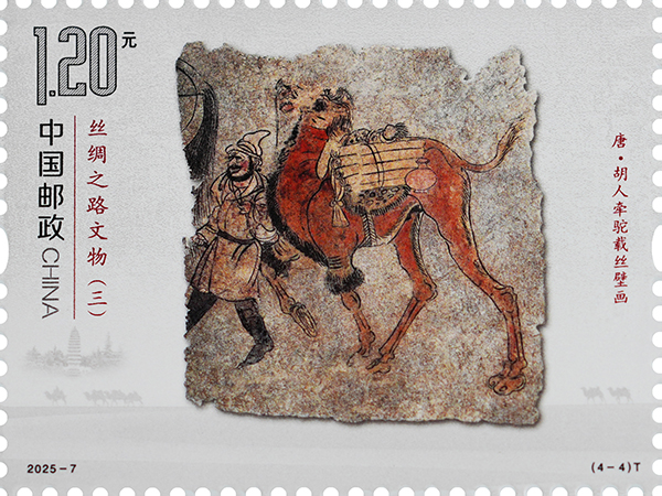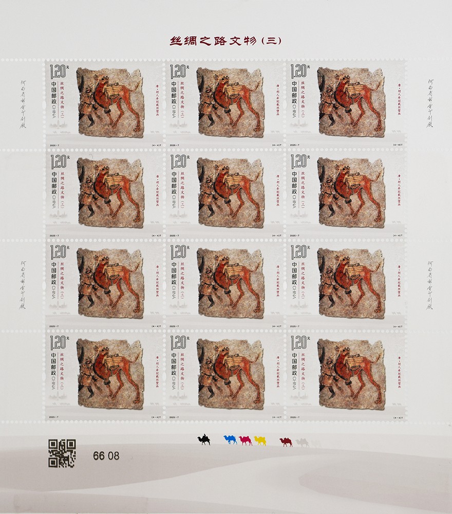 胡人牽駝?shì)d絲壁畫出土于河南省洛陽(yáng)市安國(guó)相王孺人唐氏墓,現(xiàn)藏于洛陽(yáng)古墓博物館。壁畫繪制在唐氏墓墓道西壁,正中一匹高大雄健的駱駝昂首挺胸、抬蹄甩尾、闊步前進(jìn)。駱駝背上,是捆扎好的絲綢卷和瓶子。前面牽韁繩的西域人高鼻梁、絡(luò)腮胡,頭戴尖帽,身著翻領(lǐng)長(zhǎng)衫,腳蹬黑色高靿靴,正邁步牽駝前行。該壁畫生動(dòng)再現(xiàn)了各國(guó)商人來(lái)到絲綢之路的東方起點(diǎn)之一洛陽(yáng),裝載絲綢西行走上絲綢之路的場(chǎng)景,客觀地反映了唐代的社會(huì)場(chǎng)景和世俗風(fēng)情,講述著文明交流互鑒的故事。郵票結(jié)合逆向上光和啞沙工藝,既展現(xiàn)出壁畫滄桑的歷史變遷,又突出壁畫中人物、飾物、動(dòng)物等不同的色彩效果,賦予其獨(dú)特的藝術(shù)氣質(zhì)。