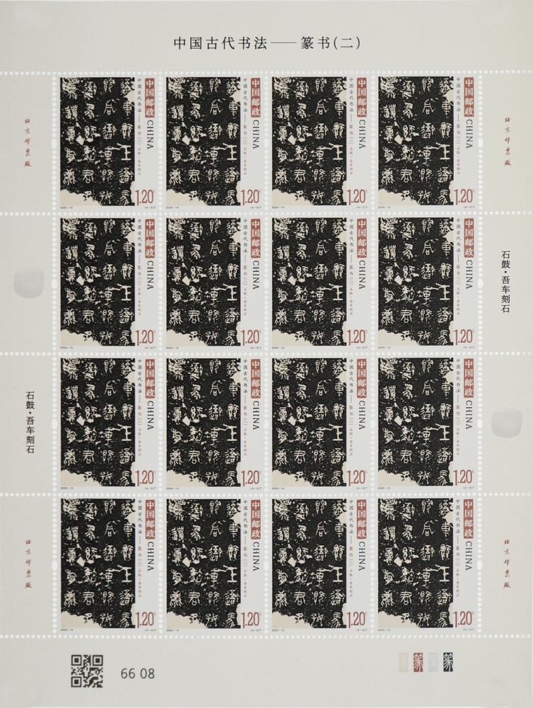 鐵足鼎的外壁刻滿了77行銘文,共計(jì)469個(gè)字,是目前發(fā)現(xiàn)的銘文最長(zhǎng)的戰(zhàn)國(guó)青銅器,銘文展現(xiàn)綺麗飄逸的裝飾趣味,是先秦古文字精品奇珍;石鼓是形似圓鼓的一組花崗巖刻石,秦人曾在十面鼓形巨石上刻下十首四言詩(shī),記述君主的游獵盛景,吾車為其中一面,石鼓文作為石刻之祖,記錄了大篆向小篆過(guò)渡的筆意;瑯琊刻石則留存李斯小篆的典范,是中國(guó)最早的刻石之一,是秦朝統(tǒng)一全國(guó)文字的典范之作,雖僅存秦二世詔書部分,仍可窺見(jiàn)“書同文”的歷史印記。小型張選用西周何尊,其“宅茲中國(guó)”銘文不僅是“中國(guó)”一詞最早實(shí)物與文獻(xiàn)見(jiàn)證,也成為中國(guó)郵政標(biāo)志的設(shè)計(jì)靈感來(lái)源。