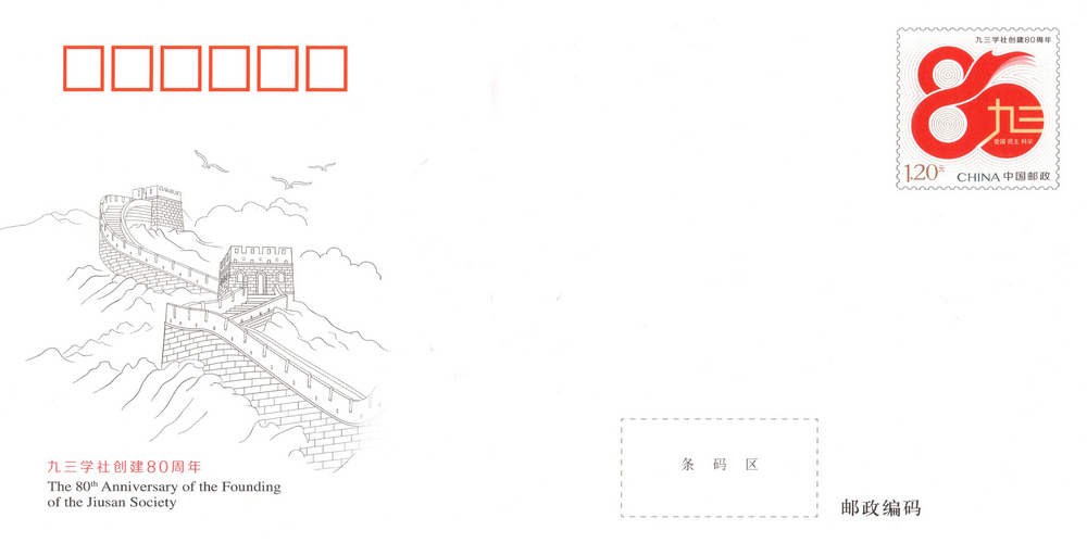中國郵政定于2025年9月3日發(fā)行《九三學(xué)社創(chuàng)建80周年》紀念郵資信封1套1枚。詳情如下: