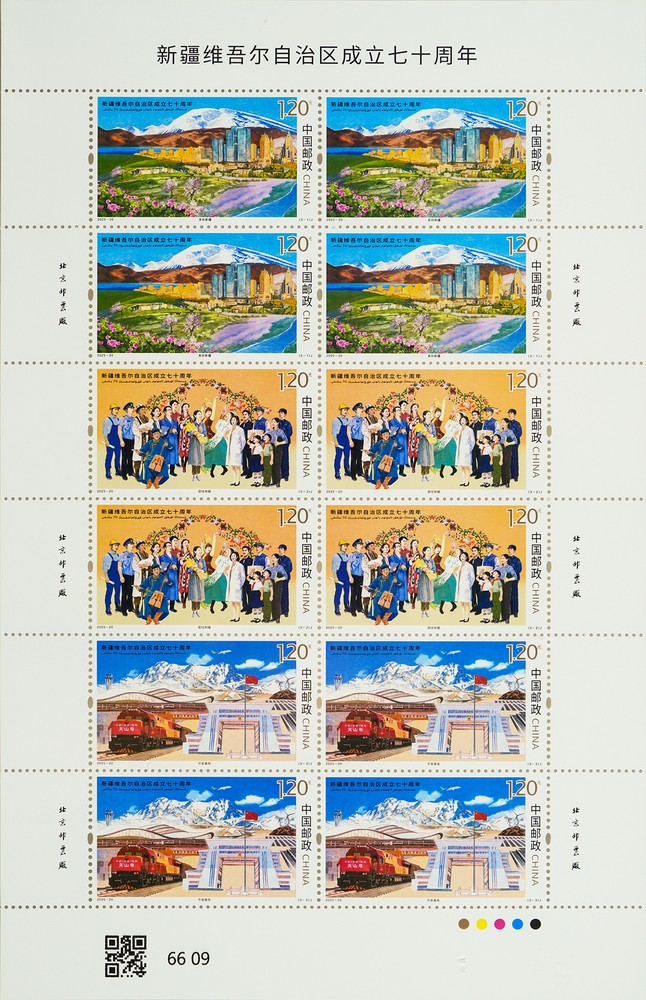 中國郵政定于2025年9月21日發(fā)行《新疆維吾爾自治區(qū)成立七十周年》紀(jì)念郵票1套3枚,郵票圖案名稱為:美麗新疆、團(tuán)結(jié)和睦、開放高地。全套郵票面值3.60元,計(jì)劃發(fā)行數(shù)量為490萬套。